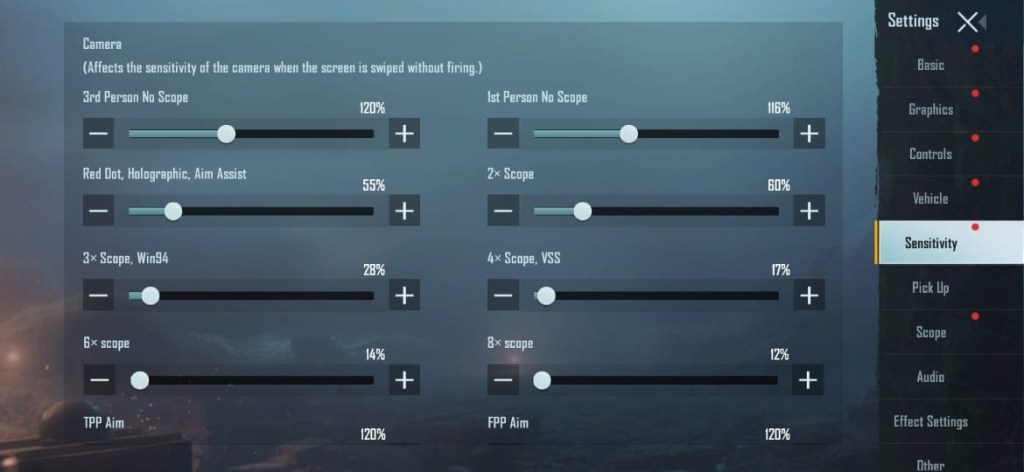 Apart from this, there are camera sensitivity settings for different scopes in the game. As a rule, should set the sensitivity to lower if the scope is bigger. Like, the 8x scope should have less sensitivity as it needs less movement, while the no scope or red dot needs higher sensitivity as there is more movement. Here’s what the values should be: